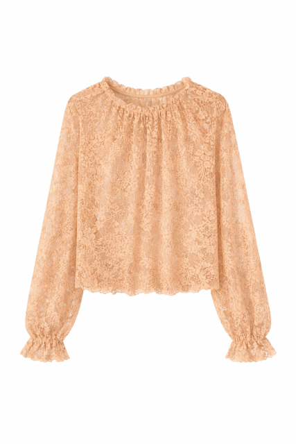 Il design presenta uno scollo arricciato con elastico, che crea un drappeggio naturale sul davanti e sulle spalle, mentre le maniche lunghe leggermente a palloncino terminano con polsino arricciato, mantenendo la linea delicata e femminile del capo. L’orlo inferiore segue la lavorazione del pizzo con un bordo morbido che completa l’estetica del capo.
