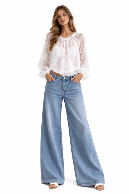 Blusa femminile realizzata in delicato pizzo floreale, caratterizzata da una linea morbida e ariosa che dona leggerezza e movimento alla silhouette. Il tessuto semi-trasparente valorizza la lavorazione del pizzo, creando un effetto raffinato e romantico perfetto sia per look quotidiani che per abbinamenti più eleganti.