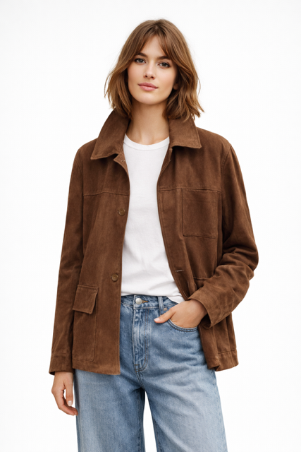 Un capo trasversale, ideale per layering su denim ampi e lineari oppure su pantaloni sartoriali, capace di dare carattere e profondità al look grazie alla ricchezza cromatica del camoscio.