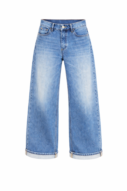 Jeans a vita regolare realizzato in denim di cotone con lavaggio medio dall’effetto leggermente vissuto. Il modello presenta una gamba ampia e dritta che garantisce una vestibilità confortevole e contemporanea, valorizzata dal risvolto sul fondo che aggiunge un dettaglio casual e di tendenza. Classico design cinque tasche, chiusura frontale con bottone e zip, cuciture a contrasto che richiamano l’estetica autentica del denim. Un capo versatile, ideale sia per look quotidiani informali sia per abbinamenti più ricercati.