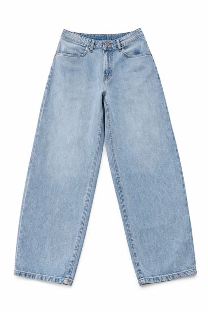 Jeans dal lavaggio chiaro con leggere sfumature effetto vintage, perfetto per un look contemporaneo ma con richiami anni ’70. La linea è ampia e rilassata, con vestibilità mom fit che valorizza il punto vita e scende morbida lungo la gamba, creando un volume moderno e disinvolto.