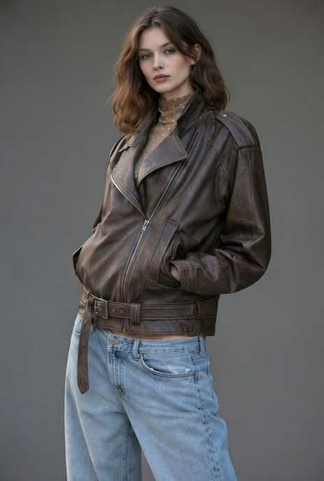 Biker donna realizzato in morbida vera pelle nappa dalla tonalità Brown, un marrone elegante e profondo che valorizza qualsiasi look. Il modello ha una linea over, con zip asimmetrica, spalle strutturate e cintura al fondo per modulare la vestibilità.